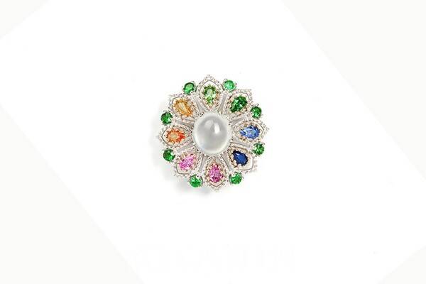 盛开的孔雀如同惊艳的银杏叶,单支的雀羽又似待放的马蹄莲,舞动的月下女神更像花瓶的剪影。孔雀已经不再是具象的生物,而成为了美好生活的一部分,也是装饰生活的精美符号。设计师巧妙构思,用最简约的语言构思设计出婉约灵动造型,既像东方灵鸟孔雀的曼妙舞动身姿,又像寓意贞洁爱情的马蹄莲花蕾,精工微镶彩色渐变的蓝宝石、沙弗莱石,造型舒雅绽放,婀娜多姿,温润典雅中倾泻无尽柔情蜜意,平添了一份东方美人的古典与柔情。像是翡翠中的"周杰伦"充满中国风的文艺气息,流淌柔软东方风情与西方镶嵌的精致工艺。