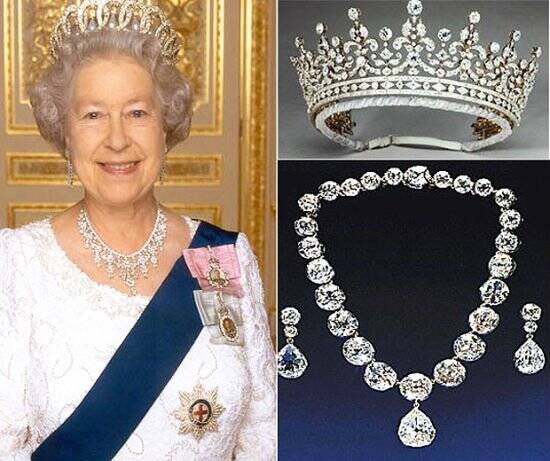 英国女王的珠宝,不看其历史只看宝石和做工,就值数亿英镑。比如,伦敦塔里陈列着王太后、女王加冕时曾戴过的王冠,上面镶嵌了2868颗钻石、273颗珍珠、17颗蓝宝石、11颗绿宝石、5颗红宝石,最闪耀的是鸽子蛋大小的钻石"光明之山",重105克拉;权杖上镶嵌的"非洲之星"是世界上最大的切割钻石,重达530克拉。