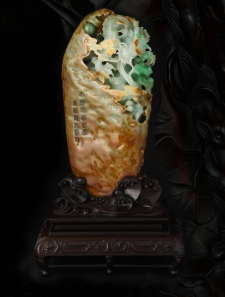 天然翡翠半雕半留,皮色鲜,肉洁净。俏色巧雕神龙,盘旋怒目,隐逸云端,见首不见尾。名为龙行天下,大有事业腾飞,大展宏图之浩气。