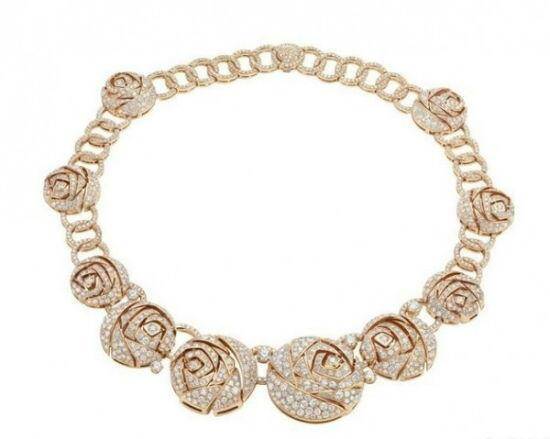 顶级珠宝玫瑰金项链,镶嵌6颗圆形明亮切割钻石(1.85 克拉)及密镶钻(30.25克拉)。
