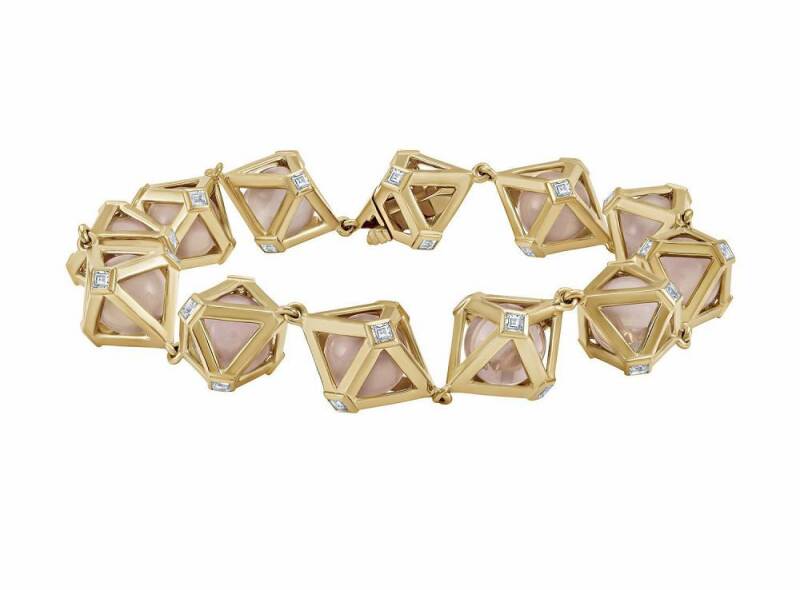 「Double Diamond」以八面体造型为设计元素,采用14K金打造出立体的外框,模仿钻石原石的天然形态。Stephen Webster 别出心裁地在其中置入一颗粉晶圆珠,可透过金质外框欣赏到圆润而饱满的宝石轮廓,外框顶点和边棱还点缀有圆形、阶梯形钻石,成为整件作品的点睛。