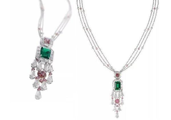 在香港举行的全球独家预览会上,力拓推出名为"大地之灵"的装饰项链。它是由象征着全球最令人梦寐以求的两大珍宝的结合:木佐祖母绿和阿盖尔粉钻。