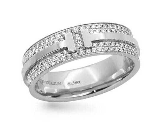「T Two」是由 Tiffany 新任设计总监Francesca Amfitheatrof亲自完成的作品,戒壁外圈环绕着纤细的「T」字形图案,佩戴起来就如同精巧的双圈戒指一样,拥有浮雕版的立体效果。